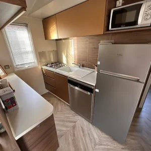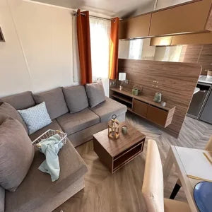 Esta casa móvil usada de la marca francesa IRM es una auténtica vivienda residencial. En muy buen estado general, esta casa móvil tiene aislamiento reforzado para las 4 estaciones. El IRM Hampton se compone de un hermoso salón con cocina equipada (lavavajillas, microondas, frigorífico-congelador) y comedor en esquina. Su gran salón ofrece un verdadero espacio. comedor, así como un sofá esquinero convertible. Esta casa móvil con acabados residenciales tiene 3 dormitorios reales. La principal es una suite principal con acceso directo al baño. Sus 3 dormitorios, incluido el dormitorio principal, le ofrecen acceso directo al baño. El IRM Hampton Résidentiel es la casa móvil de segunda mano ideal para vivir todo el año. en un camping o terreno privado.