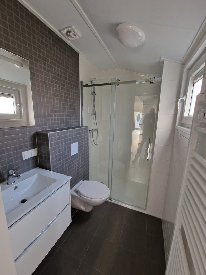 2x Somier 80 x 200 cm Dormitorio grande: Extractor mecánico Mezclador termostático 80× Plato de ducha 120 con estante y pared corredera