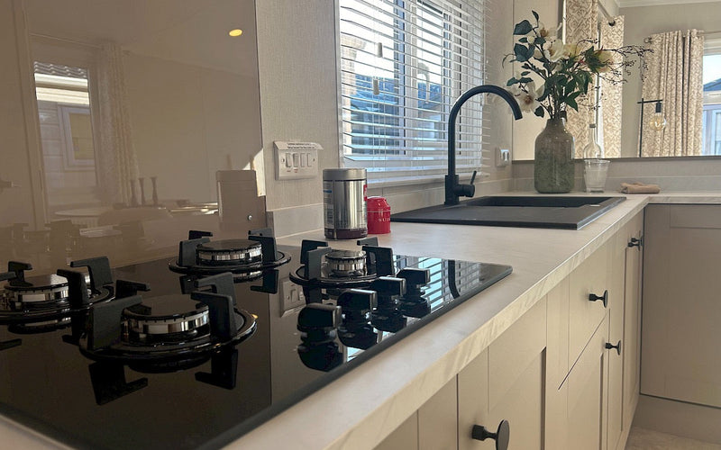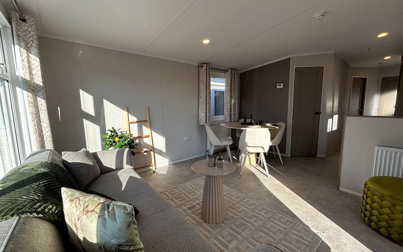 En el interior, todo se armoniza: estilo, funcionalidad y atención al detalle. La cocina cuenta con frentes de armario en gris topo claro, una encimera con efecto mármol y detalles en negro que aportan un toque fresco. La sala de estar y los dormitorios están ingeniosamente distribuidos, con amplio espacio de almacenamiento.