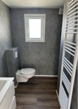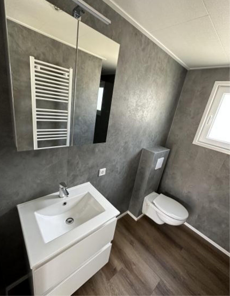 - Baño completo con, entre otros, paneles de pared de plástico, ducha de 1,20 x 0,80 con efecto lluvia, inodoro suspendido con plato y mueble de baño de lujo.