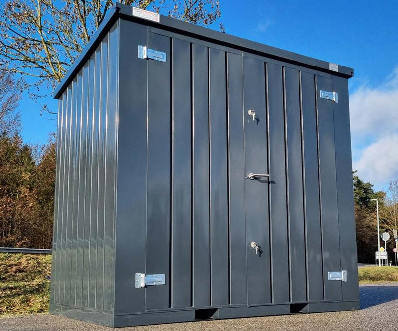 Esto permite que el contenedor sea completamente móvil si es necesario y se pueda levantar con una carretilla elevadora o una grúa, incluso con inventario dentro.
