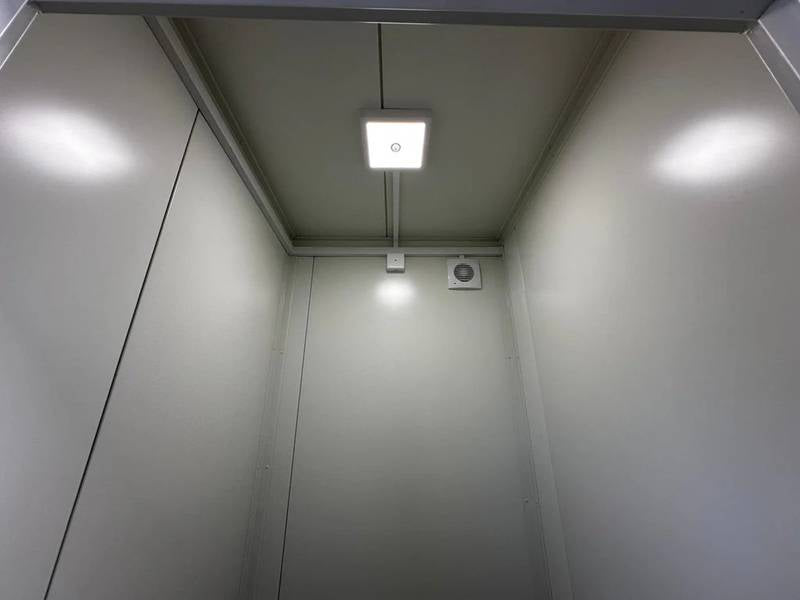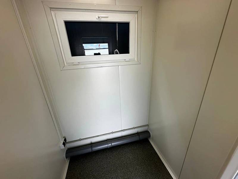 El módulo está equipado con 4 inodoros, 1 urinario y 3 lavabos, lo que permite un uso simultáneo para múltiples personas. Cuenta con una puerta en la pared corta y dos ventanas con persianas enrollables para una buena ventilación y luminosidad. La instalación eléctrica está completa y ofrece varias opciones adicionales como ducha, caldera y aire acondicionado (split) para adaptar el contenedor a tus necesidades específicas.