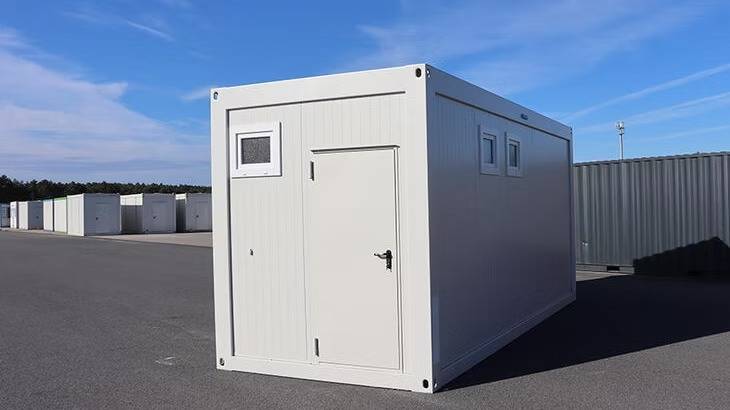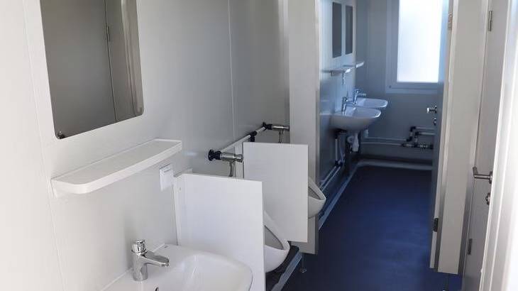 El contenedor incluye dos cabinas de ducha, dos inodoros completos con tanque y portarrollos, y dos urinarios. Además, está equipado con tres lavabos con espejo y estantería, asegurando un espacio amplio y bien equipado. La estructura cuenta con una puerta exterior, ventanas con doble acristalamiento y persiana, y ventanas basculantes para una ventilación óptima.